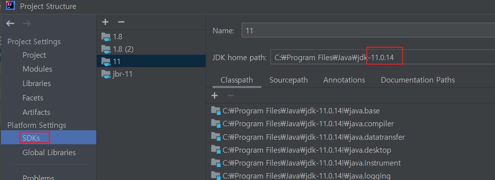 - SDKs 에 home path를 11로 변경