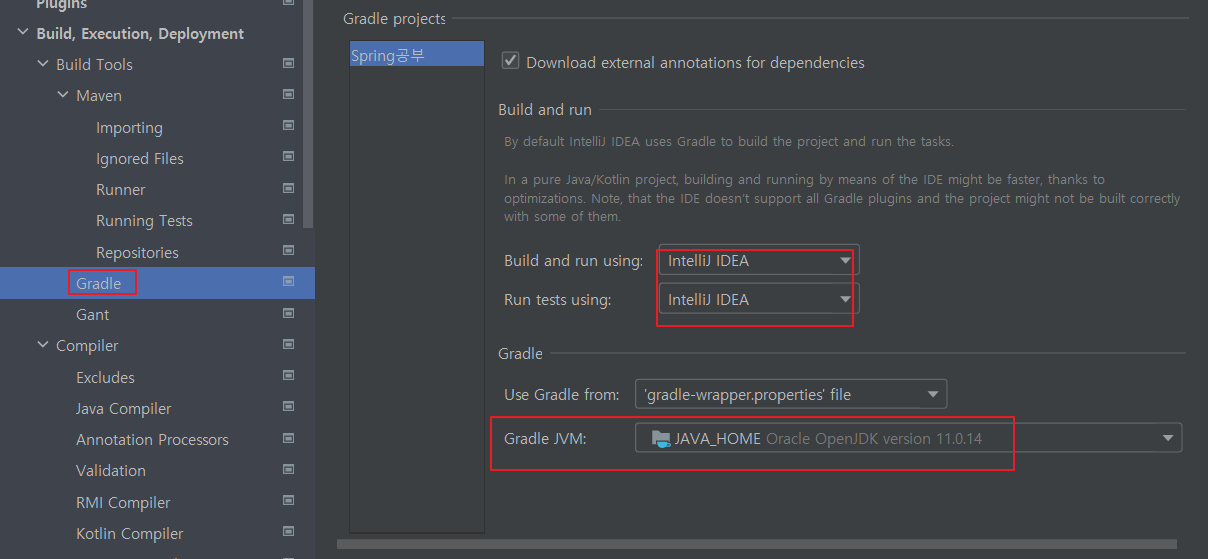 인텔리 제이 상단에 file - setting- gradle에 Gradle JVM을 11의 위치로 연결해 주었다 .