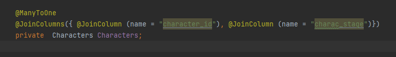 위의Collection 엔티티는 Character 엔티티를 외래키로 참조한다. 다중성은 Character : Collection= 1 : N 이므로 @ManyToOne 을 사용한다. 그리고 조인 컬럼이 2 개 이상이기 때문에 @JoinColumn 이 아닌 @JoinColumns 를 사용한다.