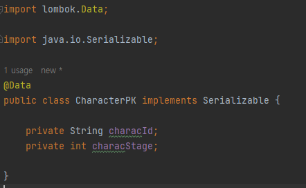 조회코드에서는 식별자 클래스인 CharacterPK 를 이용하여 조회한다. 이때 복합키를 생성자인자로 받는 생성자를 별도로 생성했는데, 필요 생성자를 별도로 구현시 기본생성자도 구현해주어야 한다.