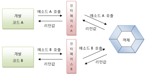 구현 객체가 인터페이스 타입에 대입되면 인터페이스에 선언된 추상 메소드를 개발 코드에서 호출할 수 있다.