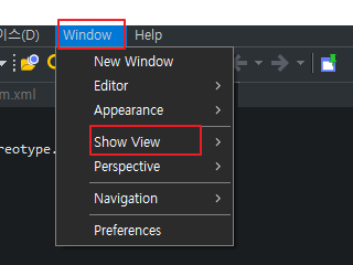 우선 스프링 상단에 window에서 Show View를 선택한다.