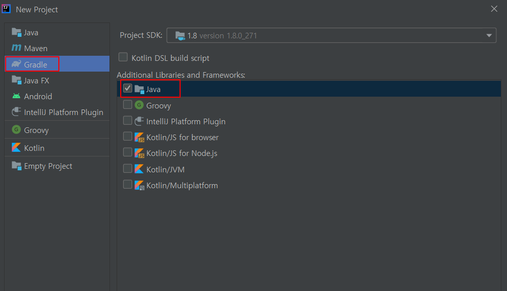 9. Gradle에 JAVA를 체크한 후 다음을 누른다.