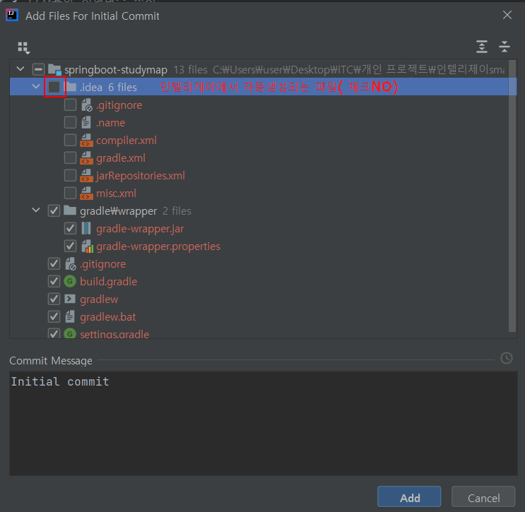 13. idea 파일은 체크를 뺴준다. 이건 인텔리제이에서 프로젝트 실행시 자동생성되는 파일이라 올리지 않아도 된다.