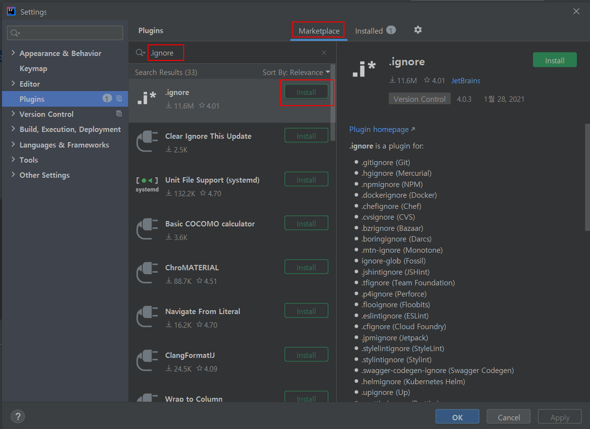 2. marketplace클릭 하여 .ignore을 검색하여 해당 파일을 install해준다.