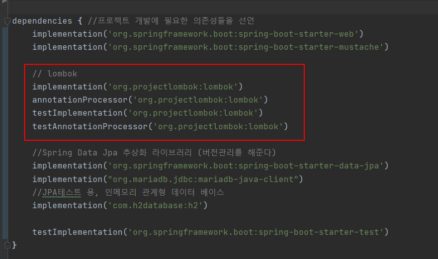 **( lombok은 프로젝트마다 설정을 해줘야한다. 설치는 한번하면 끝니지만 gradle에 입력해주는것과 setting에서 Enable annotaion processing을 체크해주는근 프로젝트마다 해줘야한다)**